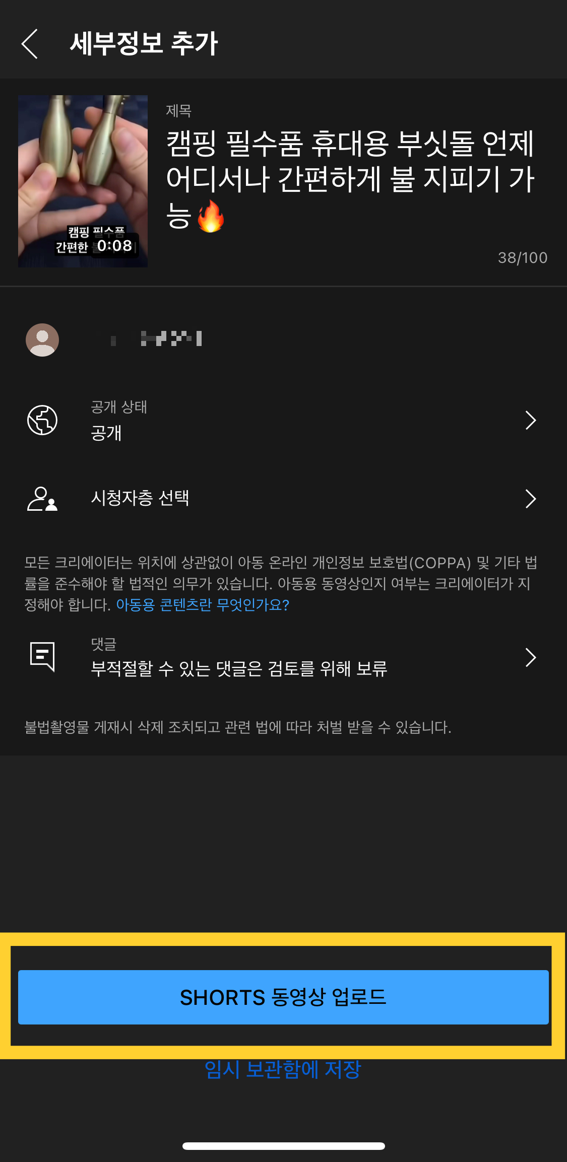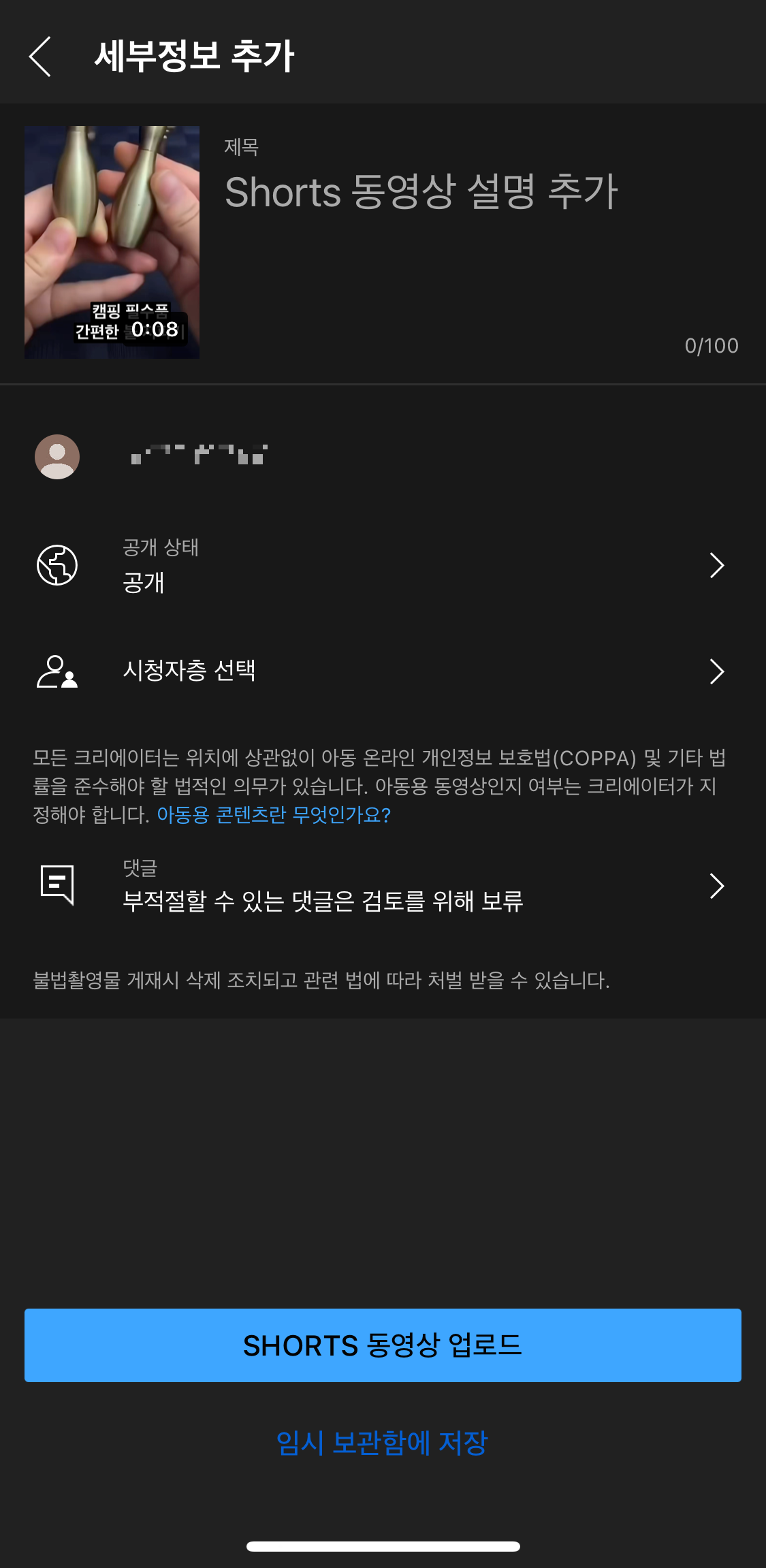 작성 하셨다면 SHORTS 동영상 업로드를 눌러줍니다.