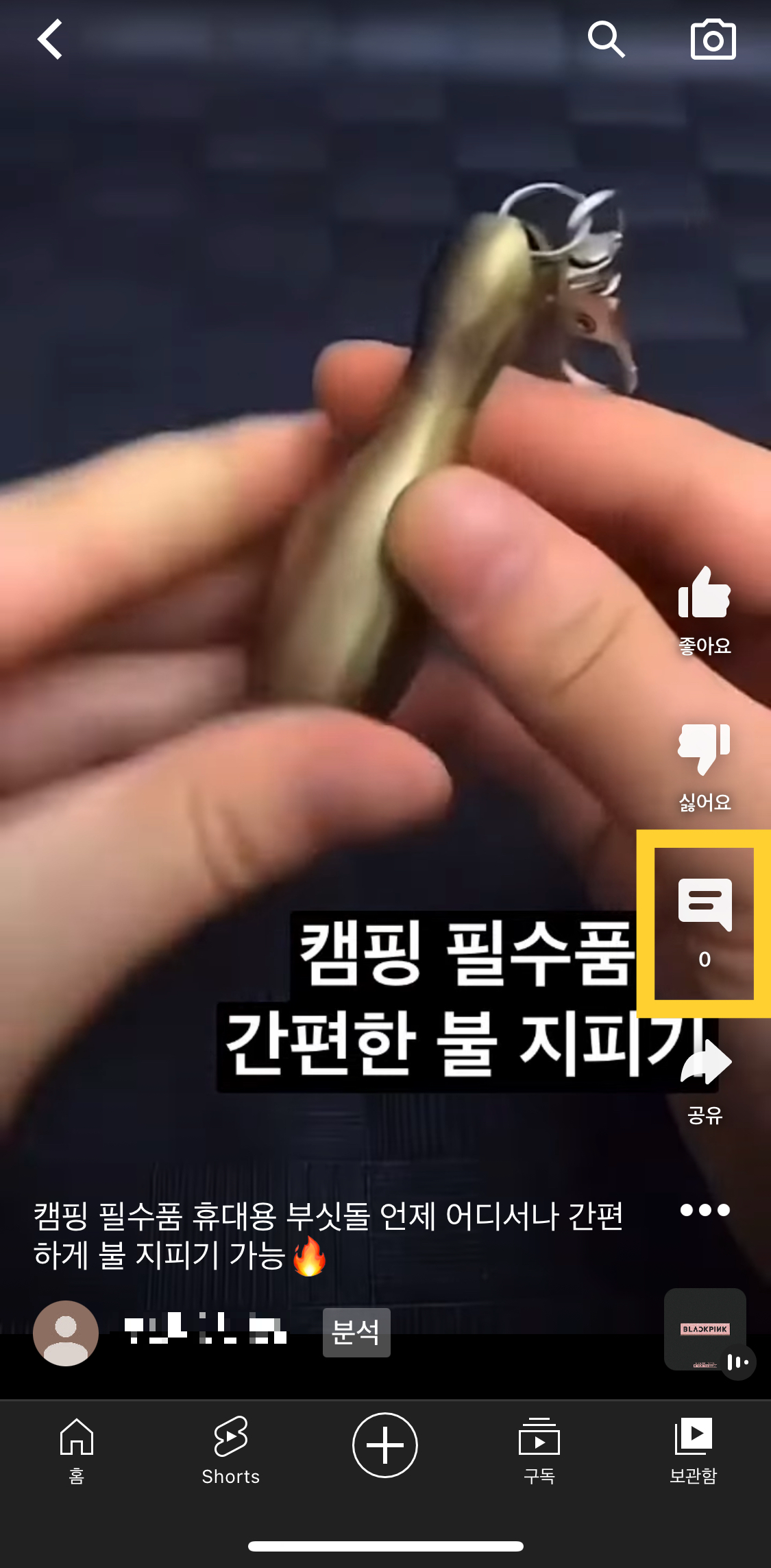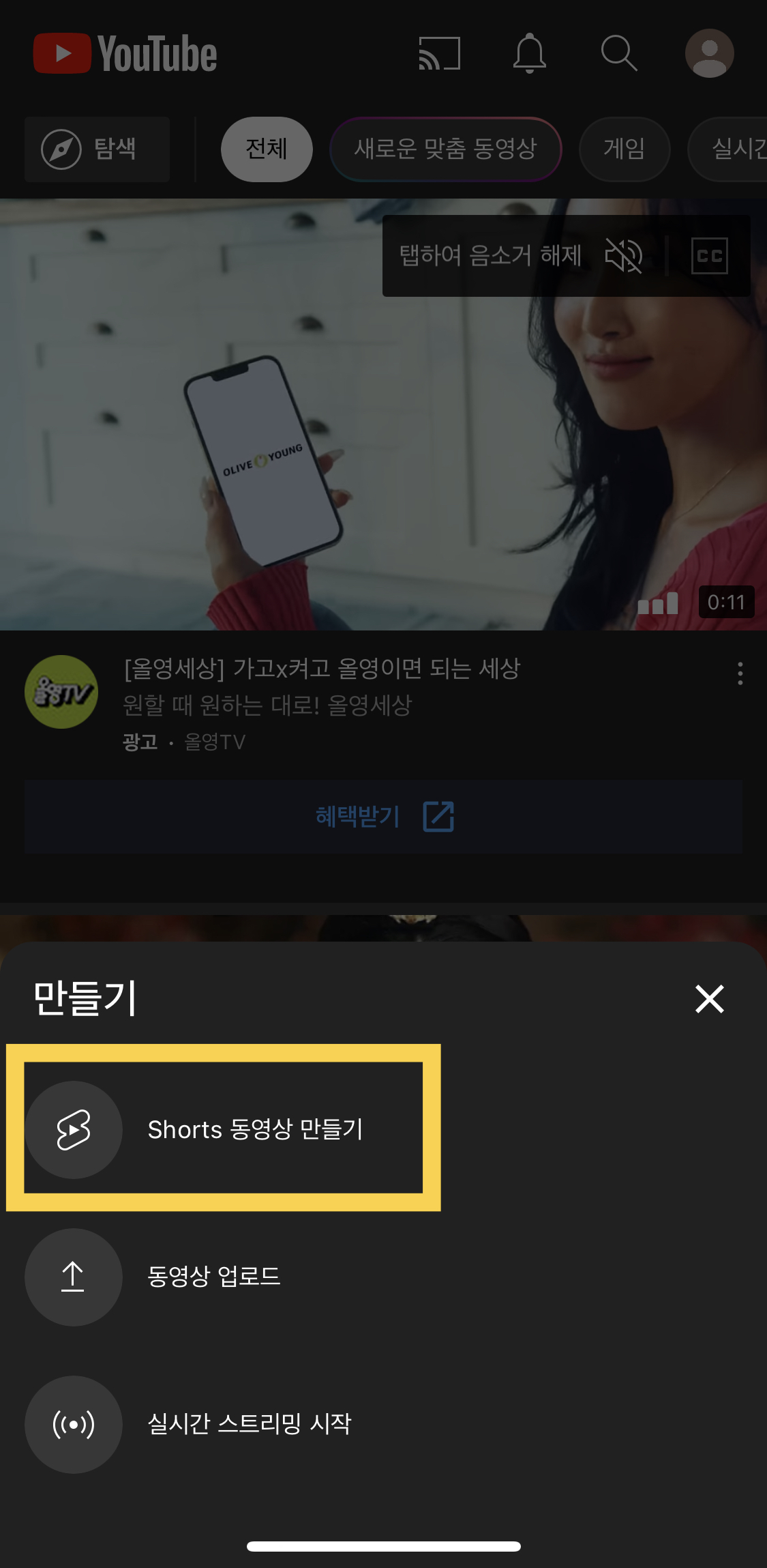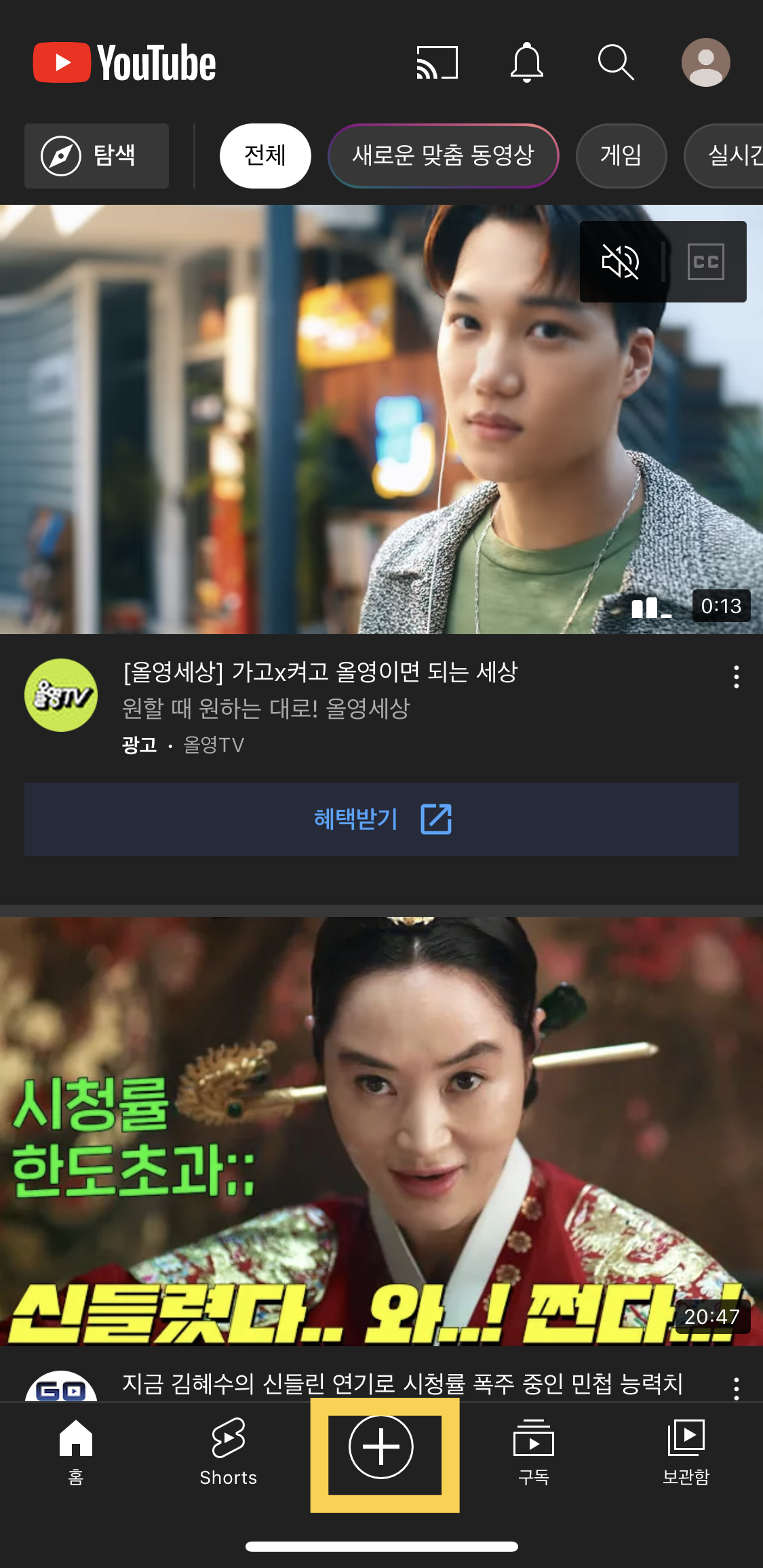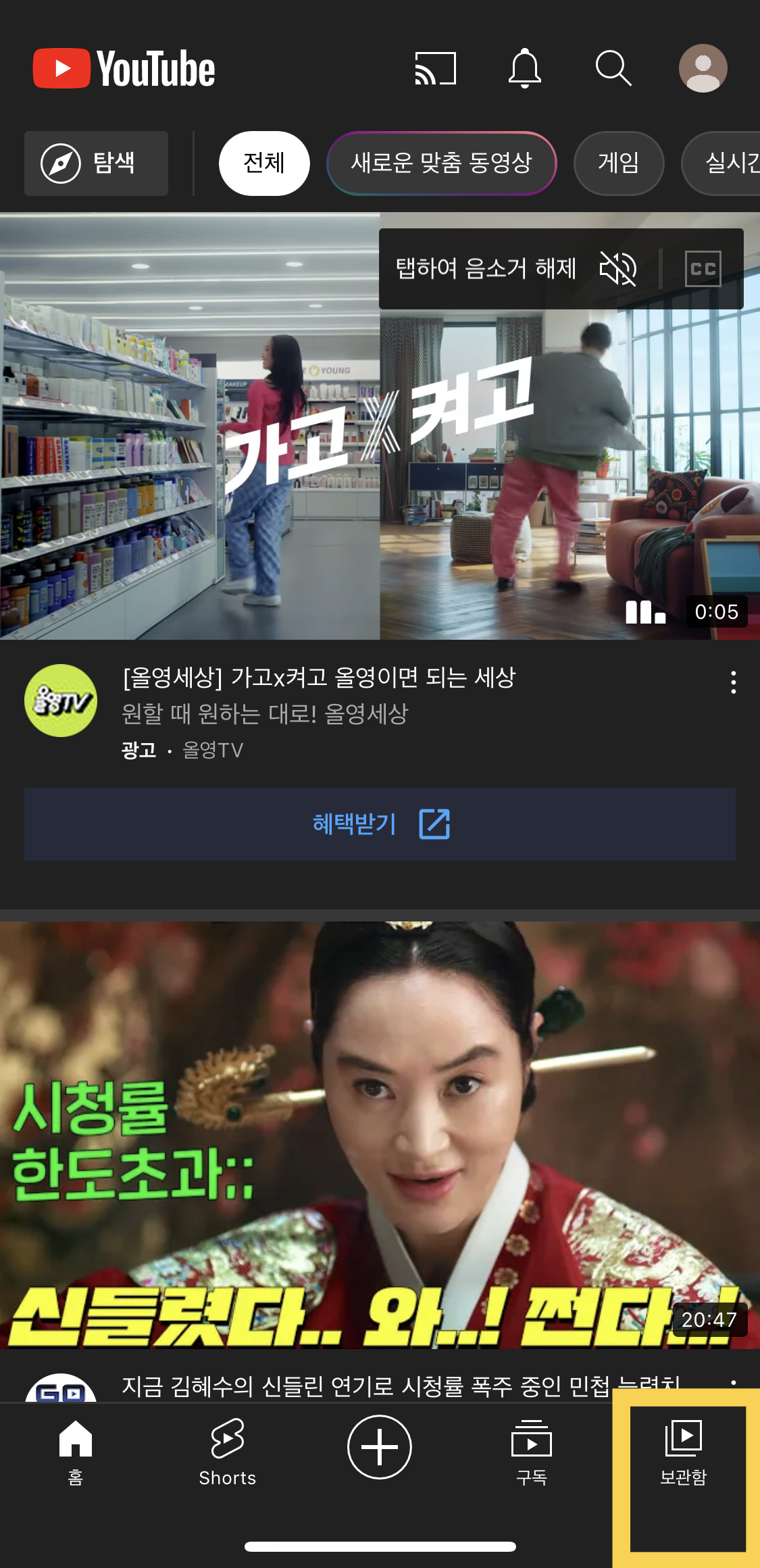 - 유튜브 우측 하단 보관함 < 내 동영상 터치