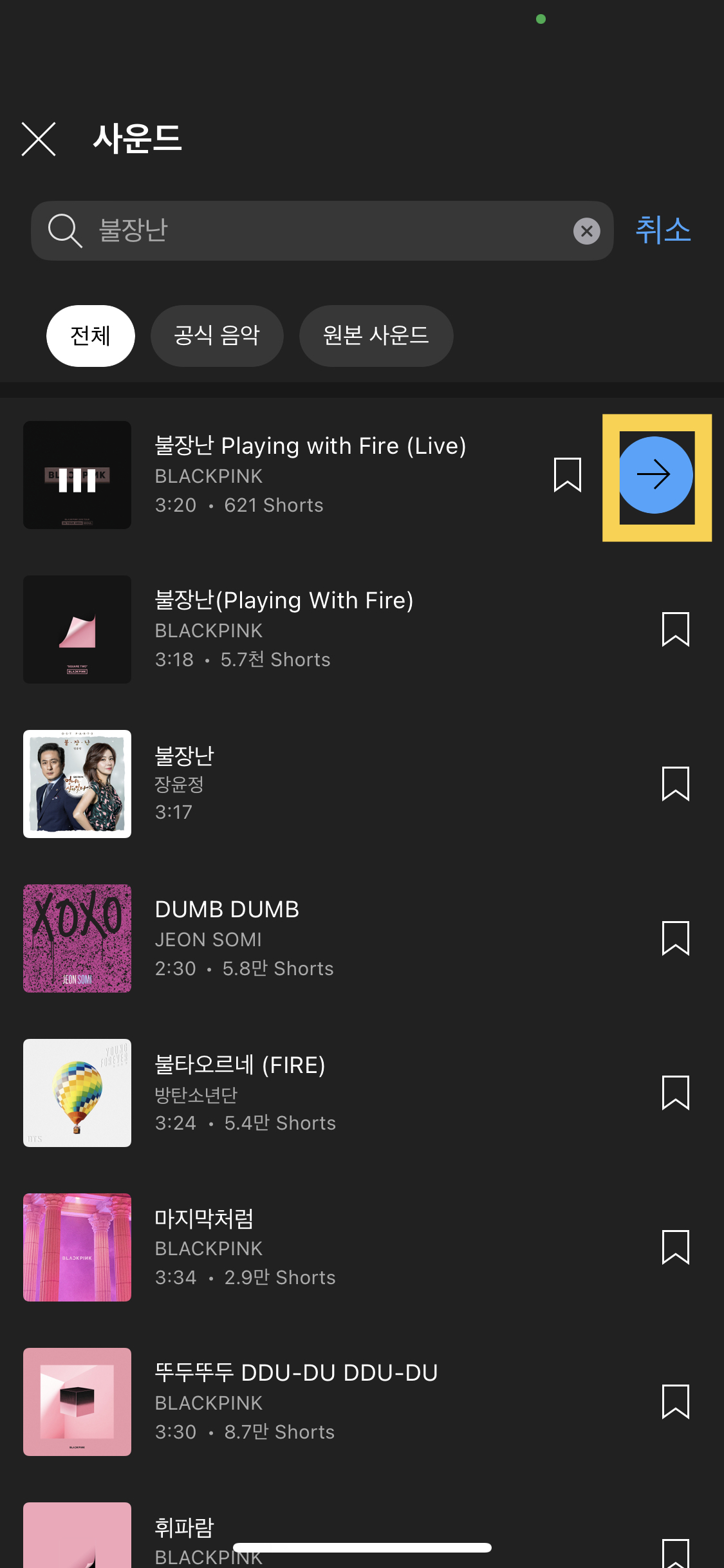 원하는 노래를 터치 후 파란색 화살표 모양을 눌러줍니다.