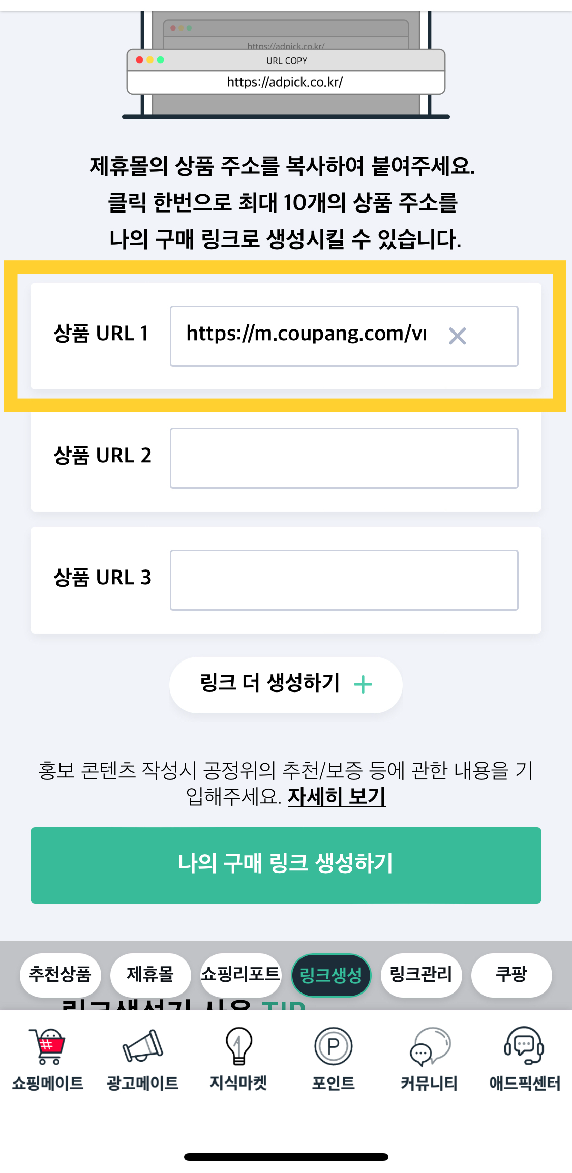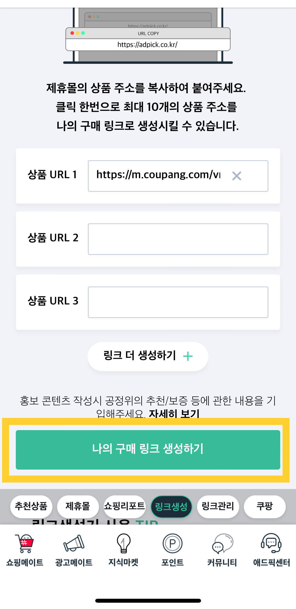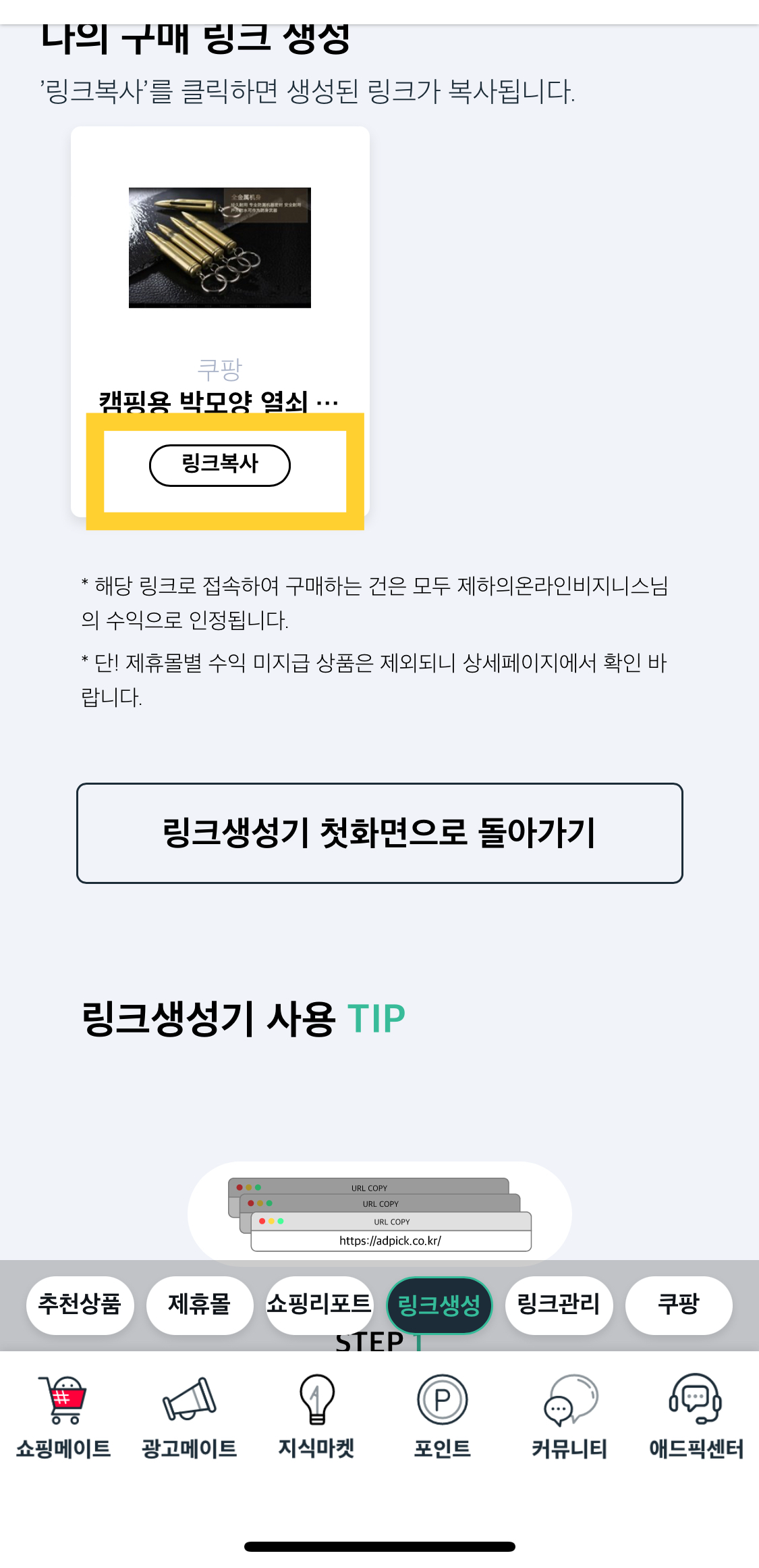 - 애드픽 로그인 후 하단 쇼핑메이트 < 링크 생성 터치