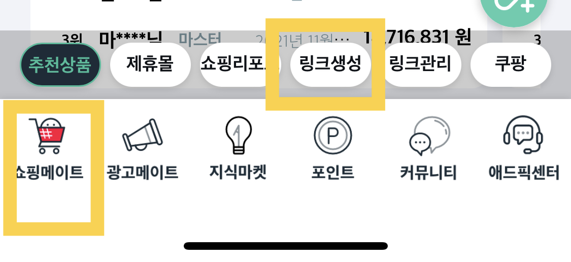 - 애드픽 로그인 후 하단 쇼핑메이트 < 링크 생성 터치