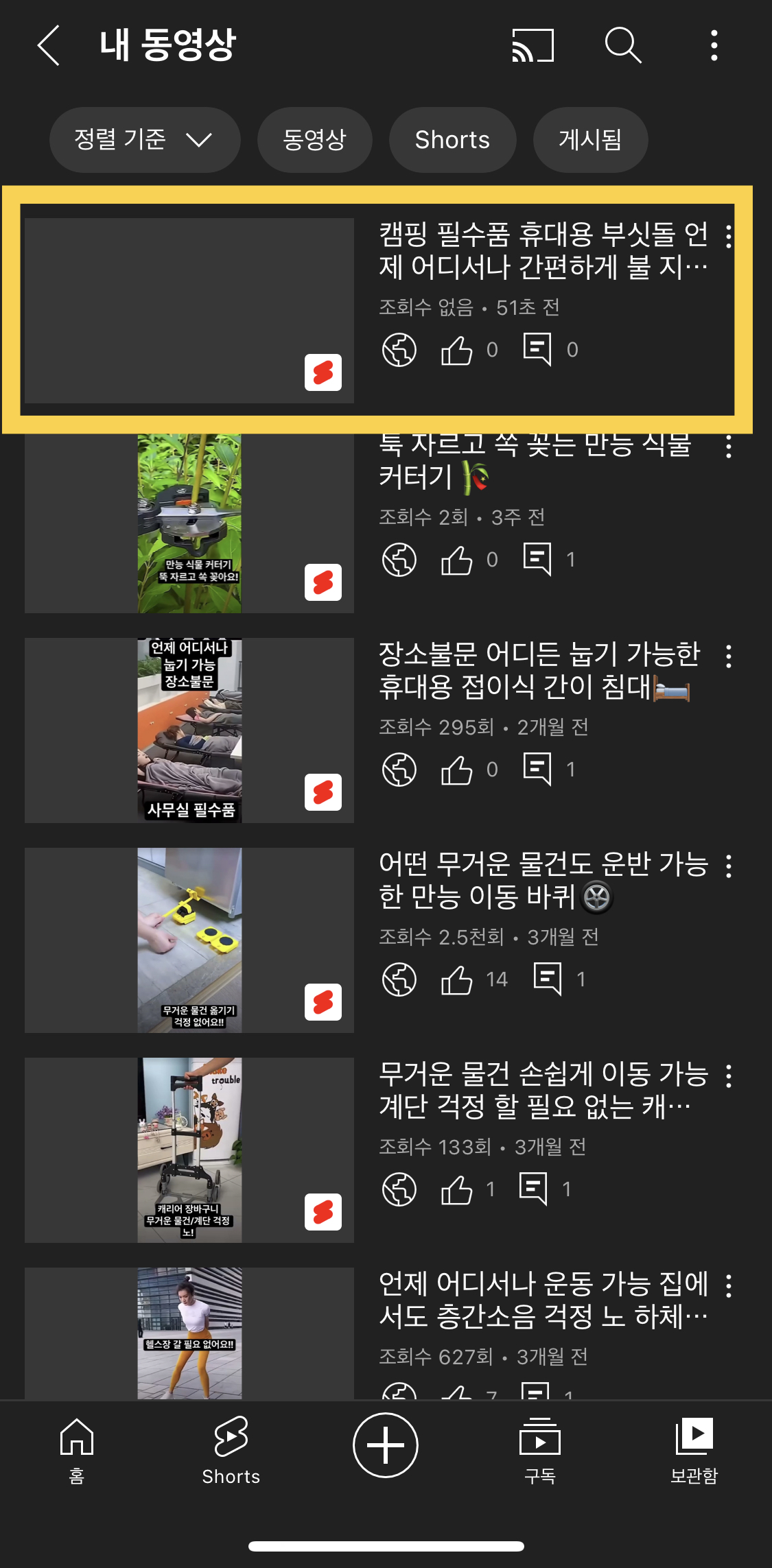 다시 유튜브로 돌아와 우측 하단 보관함 터치 후 내 동영상 들어가기