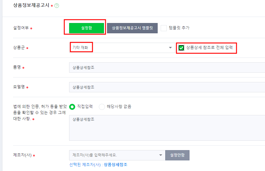 상품정보제공고시 설정 여부 < 설정함 < 상품군 기타재화 < 상품상세 참조로 전체 입력 체크