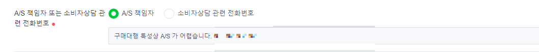 A/S 특이사항 전화번호 입력 < A/S 안내 구매대행 특성상 A/S가 어렵습니다 입력 후 저장하기 클릭