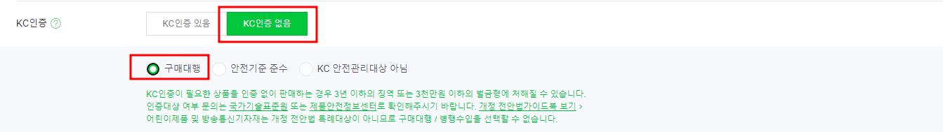 KC 인증 < KC인증 없음 클릭 < 구매대행 선택