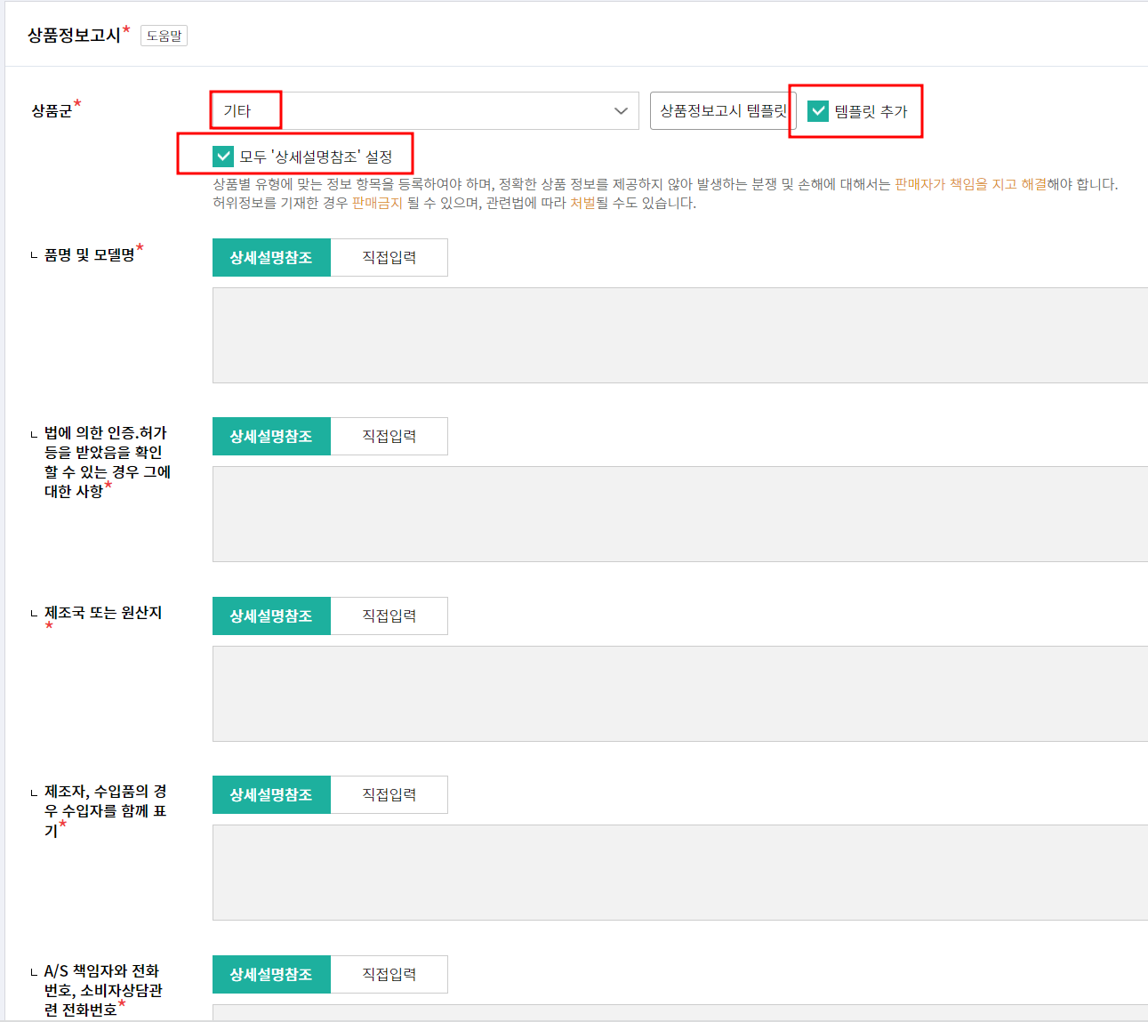 상품군 < 기타 선택 < 템플릿 추가 체크 < 모두 상세설명 참조 설정 체크
