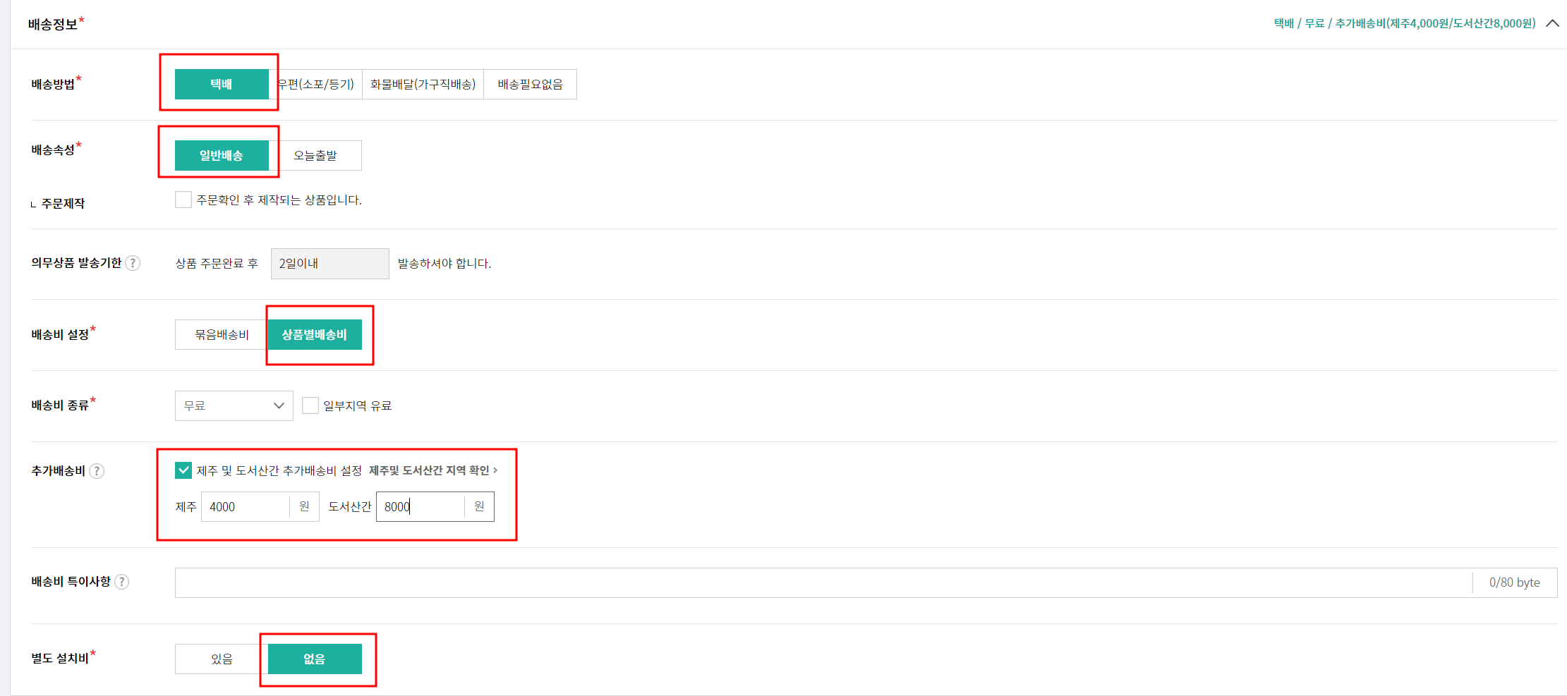 배송방법 택배 < 배송속성 일반 배송 < 배송비 설정 상품별배송비