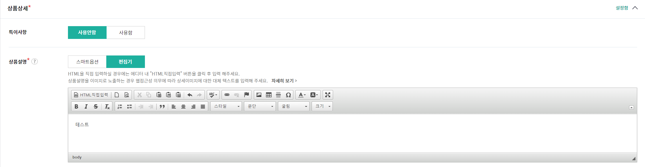 상품상세 < 특이사항 사용안함 < 상품설명 편집기 선택 후 텍스트 입력 ( 테스트 중이므로 테스트라고 입력함)