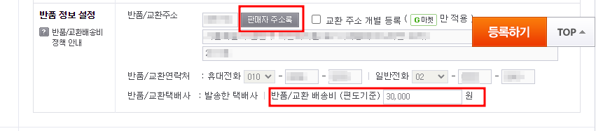 반품 정보 설정도 동일하게 판매자 주소록 버튼을 클릭하여 반품지를 선택함