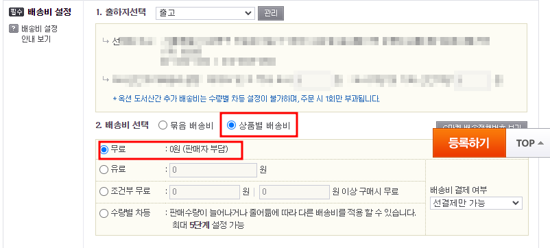배송비 설정 < 배송비 선택 < 상품별 배송비 < 무료 선택