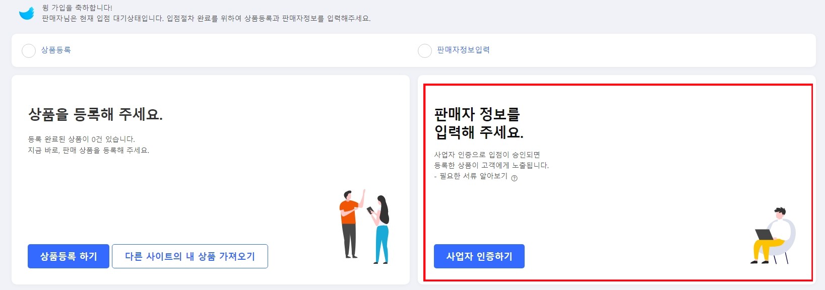 쿠팡 로그인 후 우측 판매자 정보를 입력해 주세요 사업자 인증하기를 눌러줍니다.