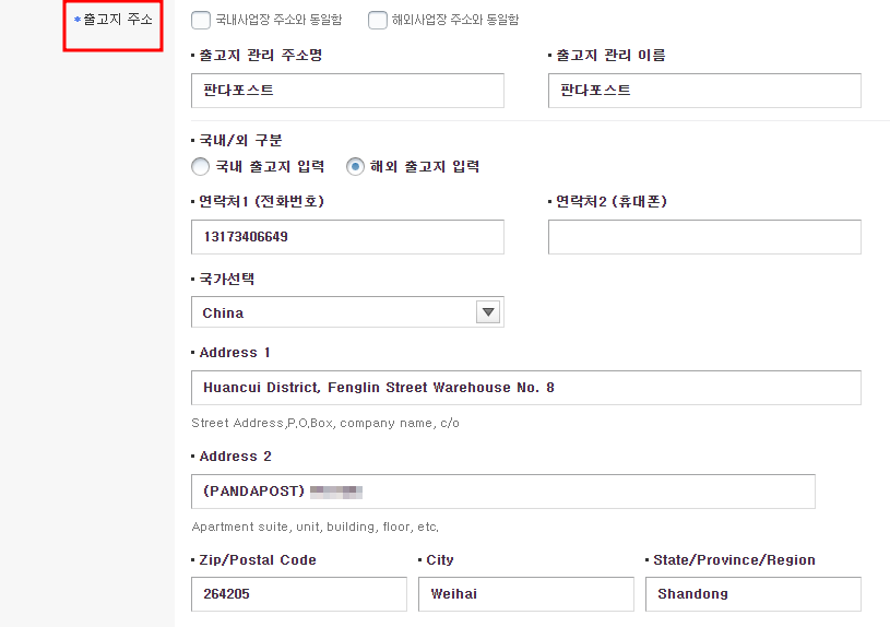 판다포스트 이용하는 분들은 가입하시고 로그인하시면 나의해외주소보기가 있습니다 그거 클릭하셔서 출고지 입력하시면 됩니다.