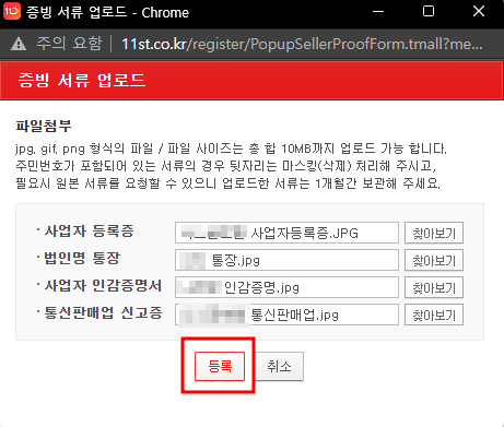 필요서류 업로드하시고 등록 버튼 누르시면 됩니다.
