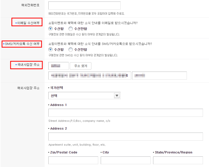 해외전화번호, 해외사업장 주소는 필수 항목이 아니니 안적으셔도 됩니다.