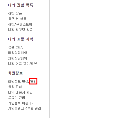 왼쪽 하단에 회원정보라고 있습니다. 바로 밑에 보시면 회원정보 변경 / 탈퇴 이렇게 있는데, 여기서 탈퇴 버튼을 클릭해주시면 됩니다.