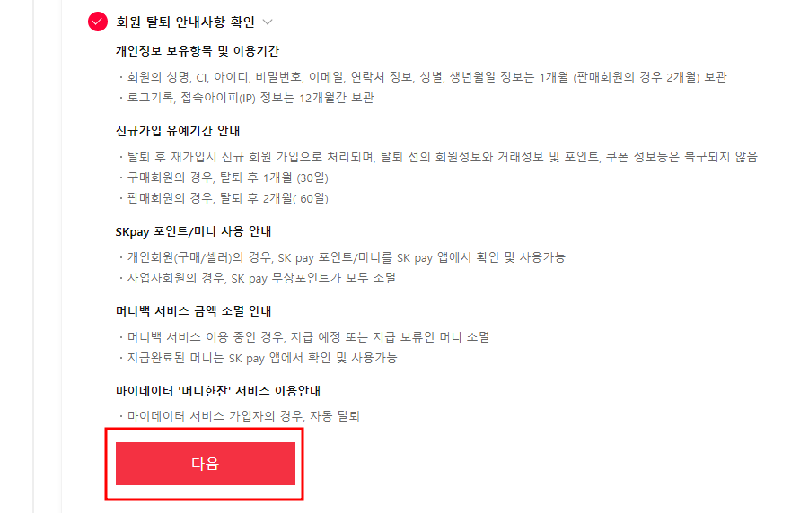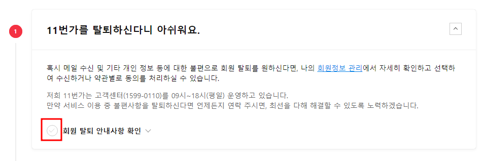 회원 탈퇴 안내사항 확인 앞에 체크를 해주셔야 됩니다.