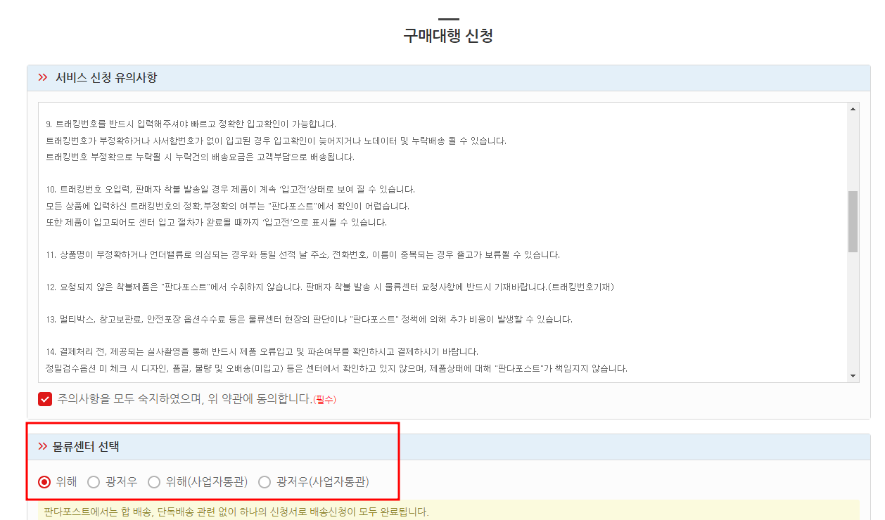 3. 구매대행 신청하기 버튼 클릭 후 물류센터 선택