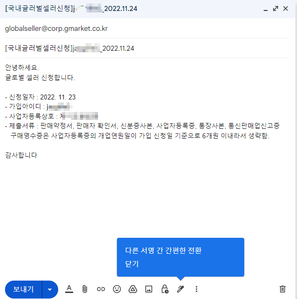 - 파일명 : 글로벌셀러입점신청서_지마켓 아이디