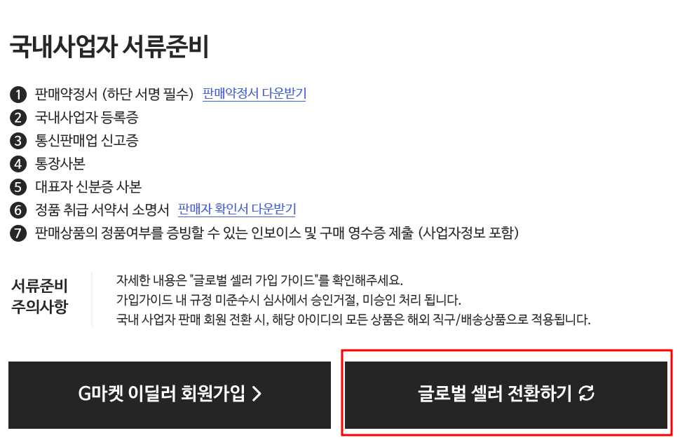 ※ 해외사업자 글로벌 셀러 전환하기 말고 국내사업자 글로벌셀러 전환하기 해야됩니다.(국내사업자 글로벌셀러 전환하기는 아무 맨 아래 있습니다.)