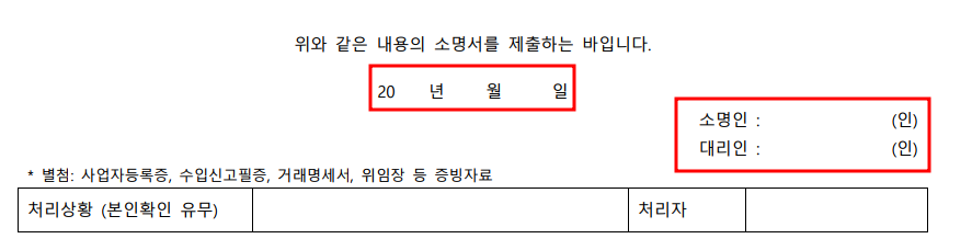 (10). 입력 날짜, 소명인, 날인 입력(출력하셔서 수기로 작성 후 스캔하셔야 됩니다)
