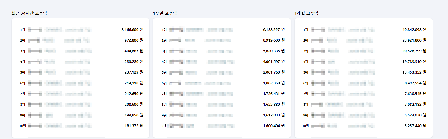 아무래도 제일 궁금한 부분이 수익을 얼마나 낼 수 있고 다른 유저들은 이미 어느 정도의 수익을 벌고 있는지가 궁금할 겁니다.